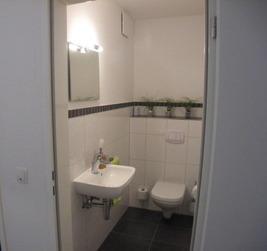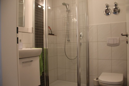 Im modern eingerichteten Badezimmer ist die Dusche mit flacher Duschtasse ( 90 x 100 ) ausgestattet.