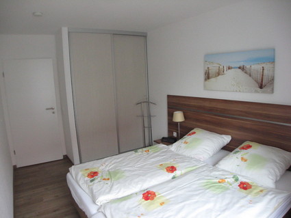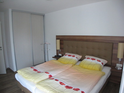 Die geräumigen Schlafzimmer bieten auch den Platz das ( vorhandene ) Kinderbett zu stellen. Das obige Schlafzimmer mit Doppelbett verfügt über einen direkten Zugang zur Terasse.